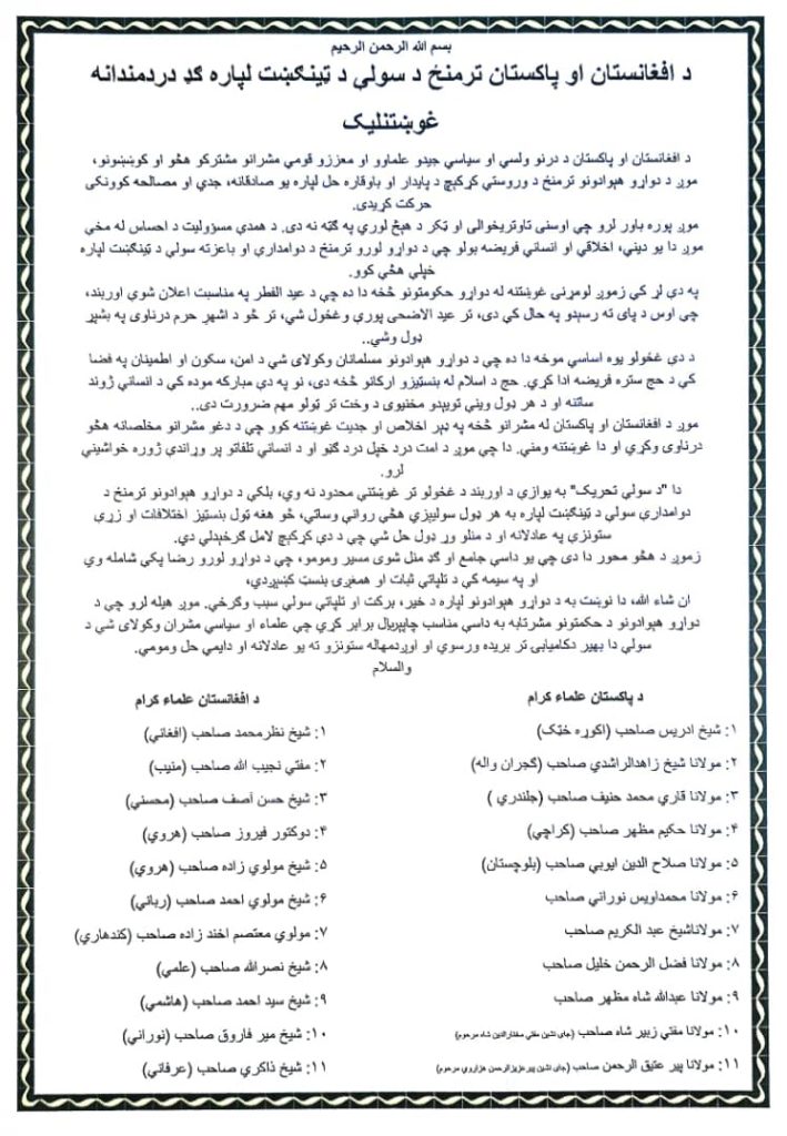 Eleven Pakistani and as many Afghan clerics signed a joint statement released on Tuesday night.